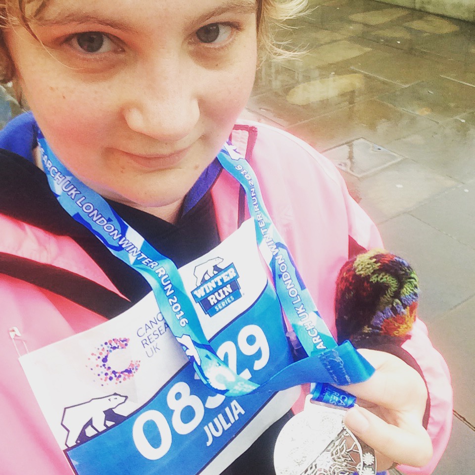 It was the Winter Run today, a 10k race through Central London, which sounds pretty amazing, and really, really was. I ran it last year before injuring my ankle, and it took me 1 hour 31 minutes, which was pretty slow, but I did it, and I got a medal to prove it. I then signed up for this year in a fit of adrenaline based madness, and promptly forgot about it, particularly when I had to pull out of the Royal Parks Half Marathon when my ankle meant I couldn't really train for it. In November, Hattie suddenly piped up about my big run, and I went and checked through my emails, and hurrah, I was signed up again. Hurrah might not have been my actual first thought.